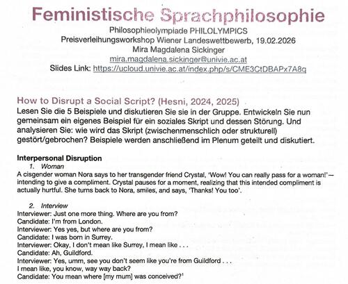 Aktuelle Debatten in der Feministischen Sprachphilosophie. Debatten über Soziale Skripte, das sind sprachliche, soziale Einheiten, die Erwartungen hinsichtlich Normen, Sprache und Verhalten kodieren. Sie geben vor, wie sich Personen in bestimmten Situationen zu verhalten haben und was diese sagen sollen. Soziale Skripte werden oft verinnerlicht.